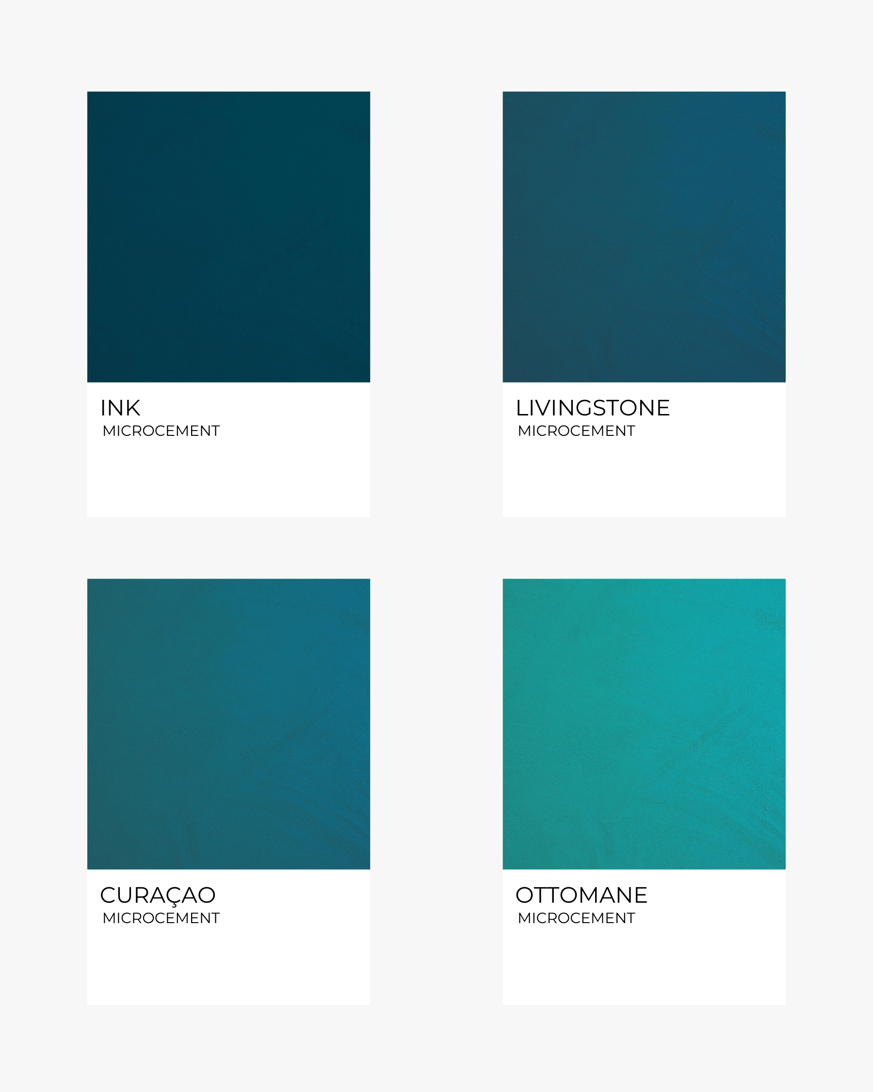 Deep blues are inherently calming, evoking water, twilight skies, and mineral depth. When expressed through microcement, sapphire and teal blues take on a distinctly architectural quality—smooth, seamless, and quietly confident. Their depth enhances microcement’s continuous surface, creating spaces that feel expansive yet contained, particularly when light moves softly across the matte finish.
