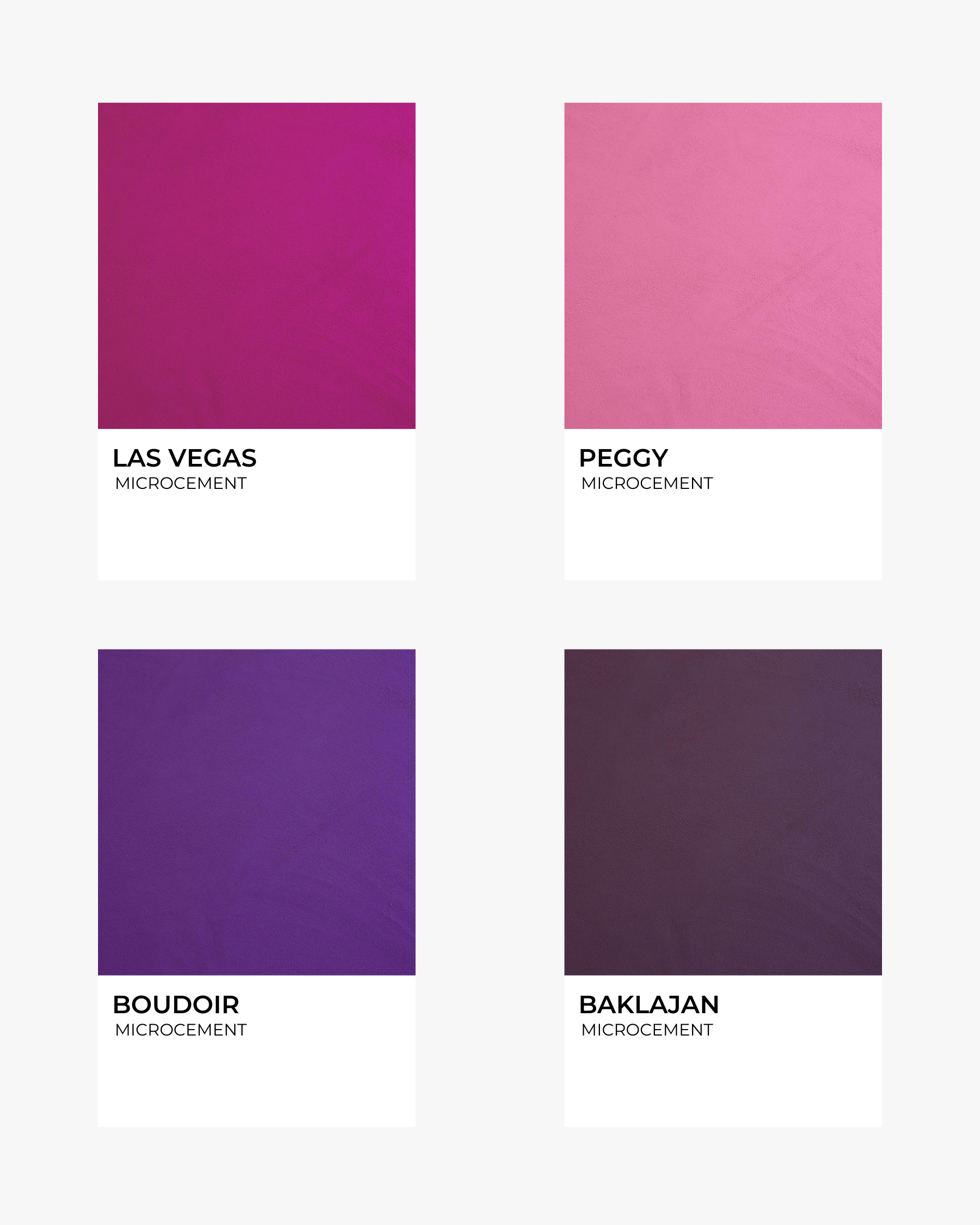 Plum, magenta, and amethyst tones introduce softness with a luxurious edge. Rich yet restrained, these colours are softened by microcement’s matte finish, allowing depth without excess. The result is an atmosphere that feels intimate and composed—never theatrical, always intentional.
